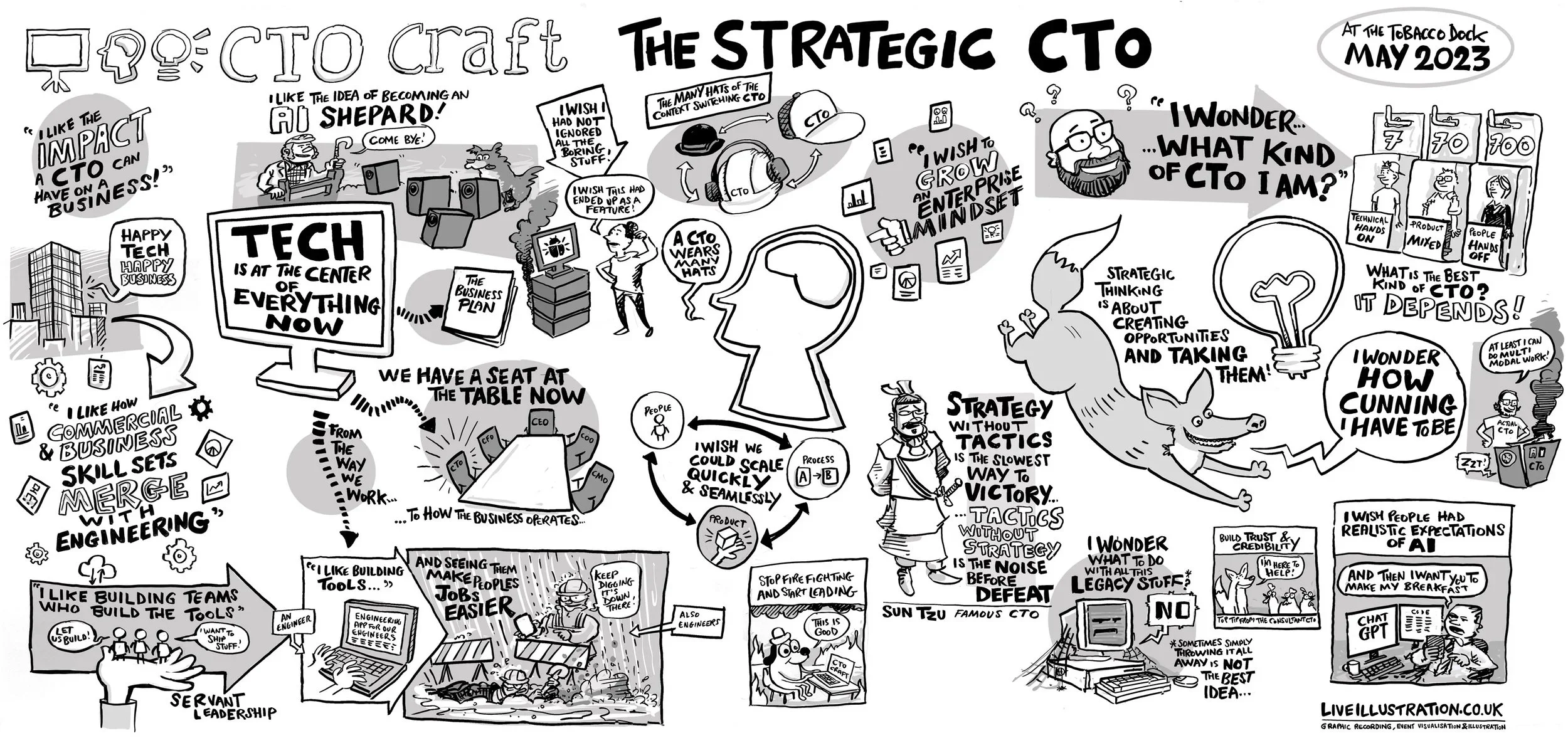 This is a method that really engages audiences, people are thrilled to see their concept drawn. It’s a sort of event based moment of co-creation. A recent event where this method had a fantastic impact was for CTO Craft. And one of the first people to come up to us immediately quoted Szun Zu!