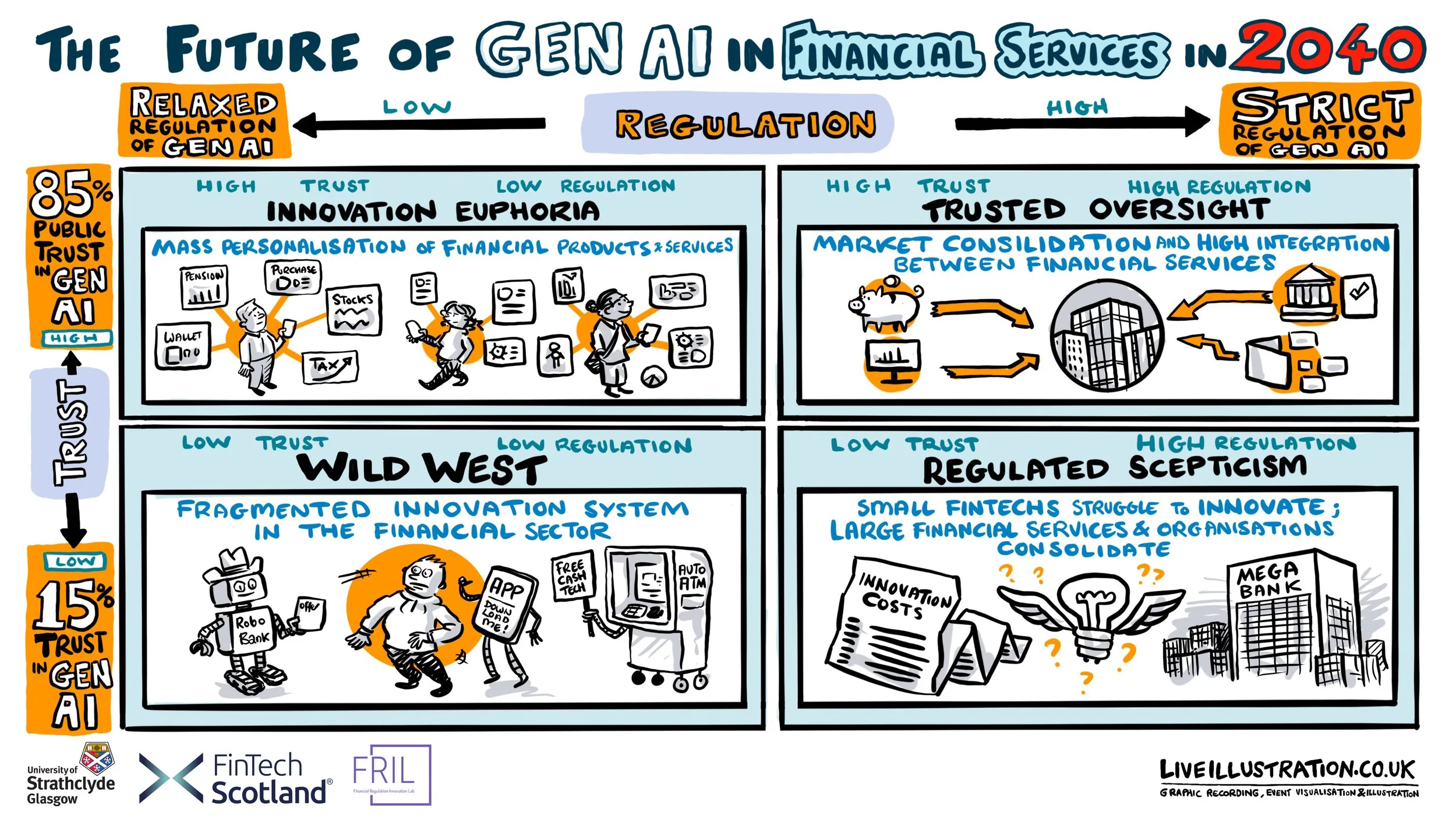 “Our project on the Future of GenAI for Financial Services in 2040, conducted with the Financial Regulation Innovation Lab in the Strathclyde Business School, involved scenario thinking. Scenarios are developed through a process of disciplined imagination. We were pleased to have worked with Live Illustration, who creatively depicted the four contrasting scenarios through illustrations that clearly convey the key message of each future. Live Illustration’s experience and creativity strengthened our aim of producing images that challenge current assumptions and help stakeholders to imagine plausible futures”.